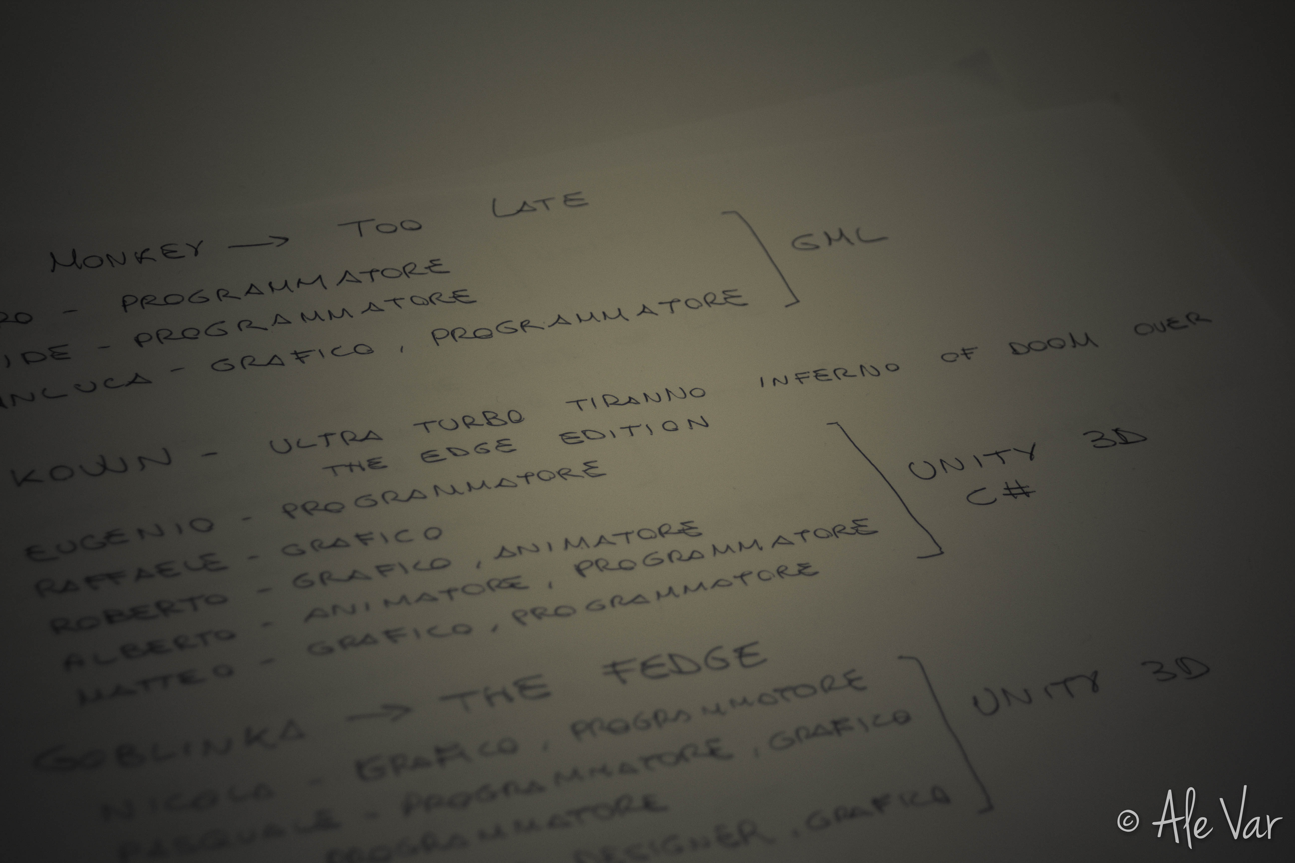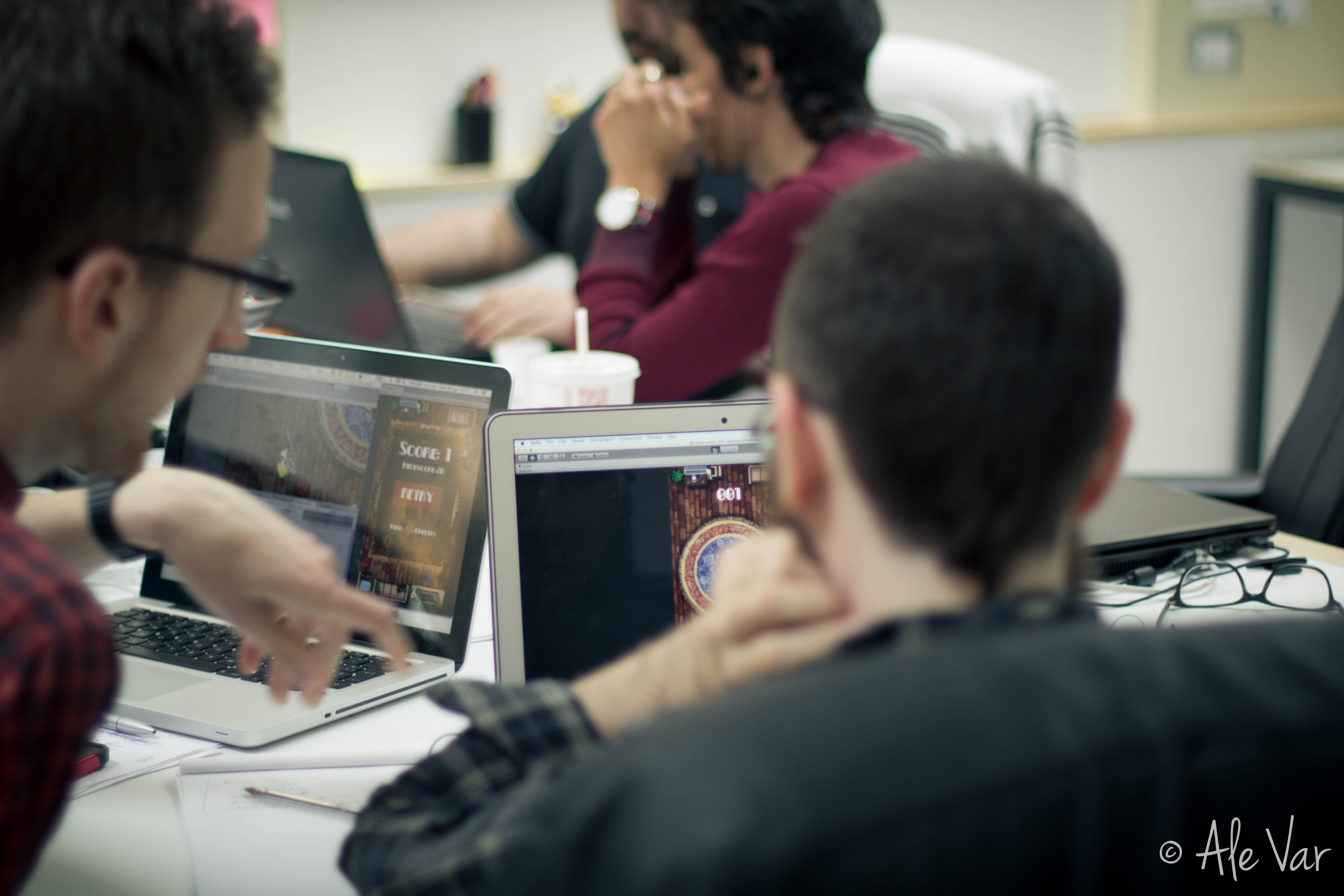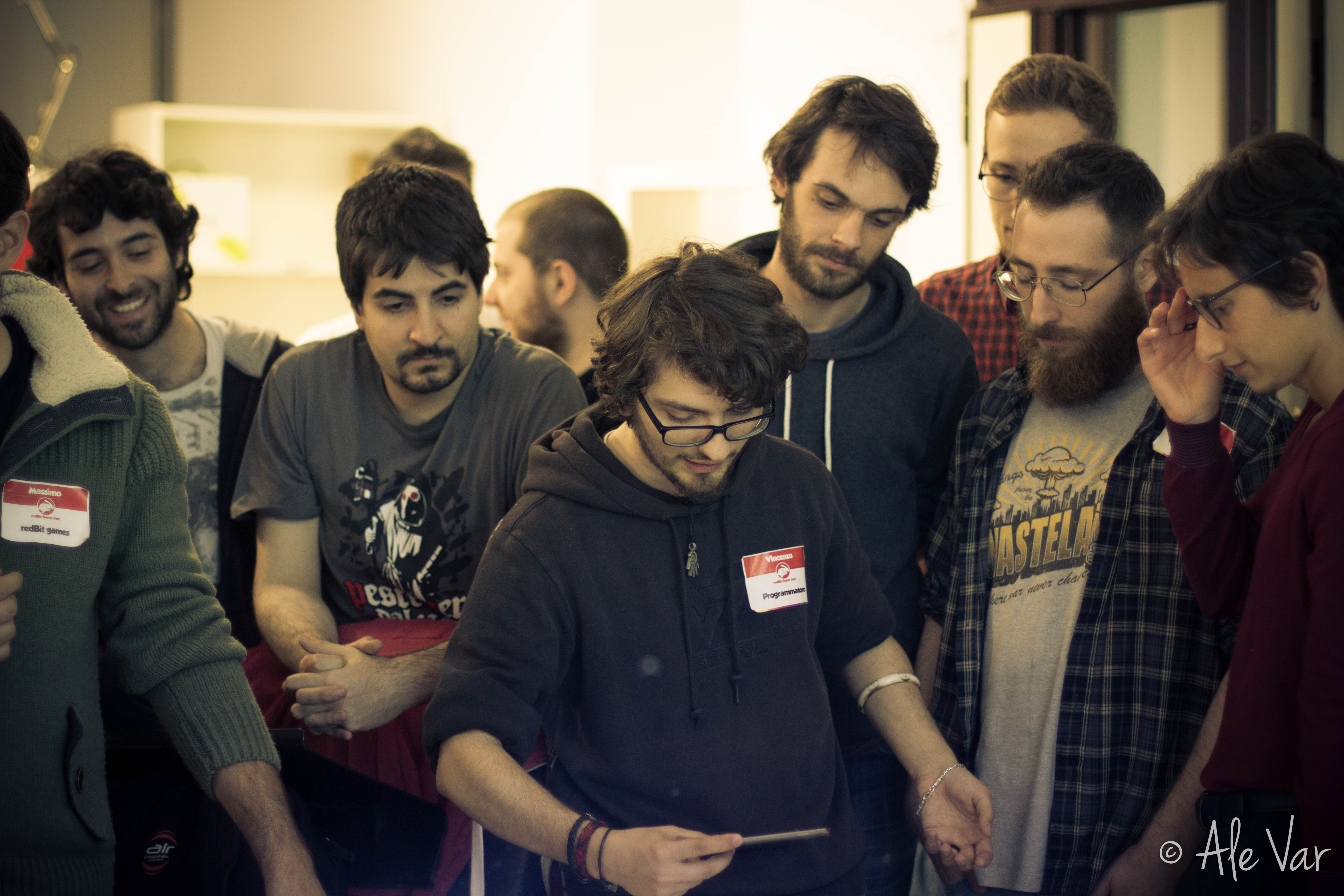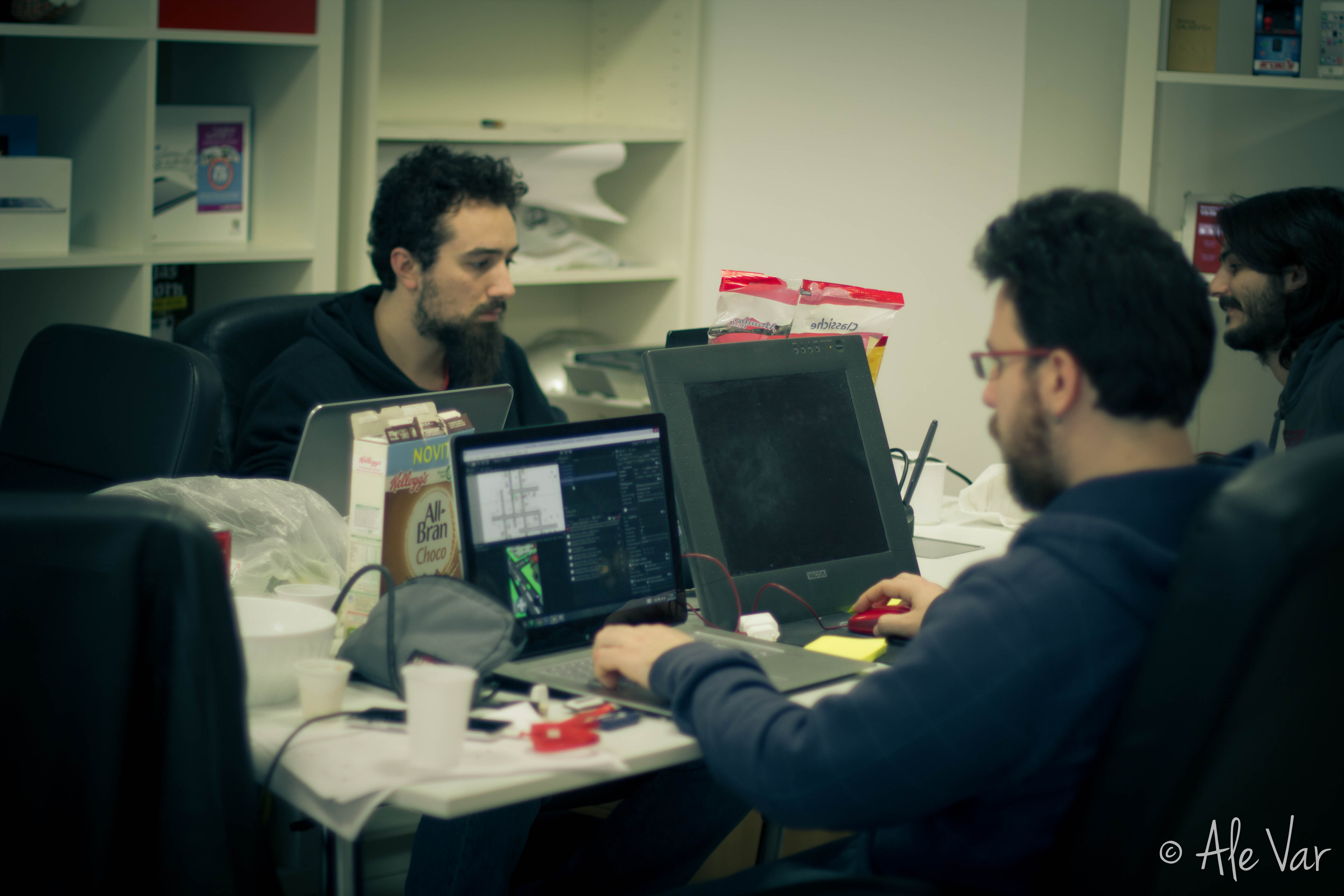 Ma andiamo con ordine. L’evento si è aperto con una pizzata generale dopo l’arrivo dei partecipanti negli uffici redBit games. Riempita la pancia era ora di riempire le teste… non ce la siamo però sentita di organizzare uno speech con tanto di slide powerpoint, per presentare chi è redBit games (potete leggerlo, in inglese, qui), il nostro lavoro, ecc ecc. Abbiamo preferito un discorso a braccio, semplice e conciso (neanche 5 minuti) per presentare l’evento e il tema della stesso, cioè Over The Edge (Oltre il limite). In sintesi? Siete qui per jammare, ora scatenate l’inferno! Pochissime regole: non formate team più grandi di 4-5 persone perché sennò non combinate niente, sviluppate un gioco per smartphone con qualunque ambiente di sviluppo, aiutatevi tra di voi e soprattutto cercate di divertirvi. E così è stato!