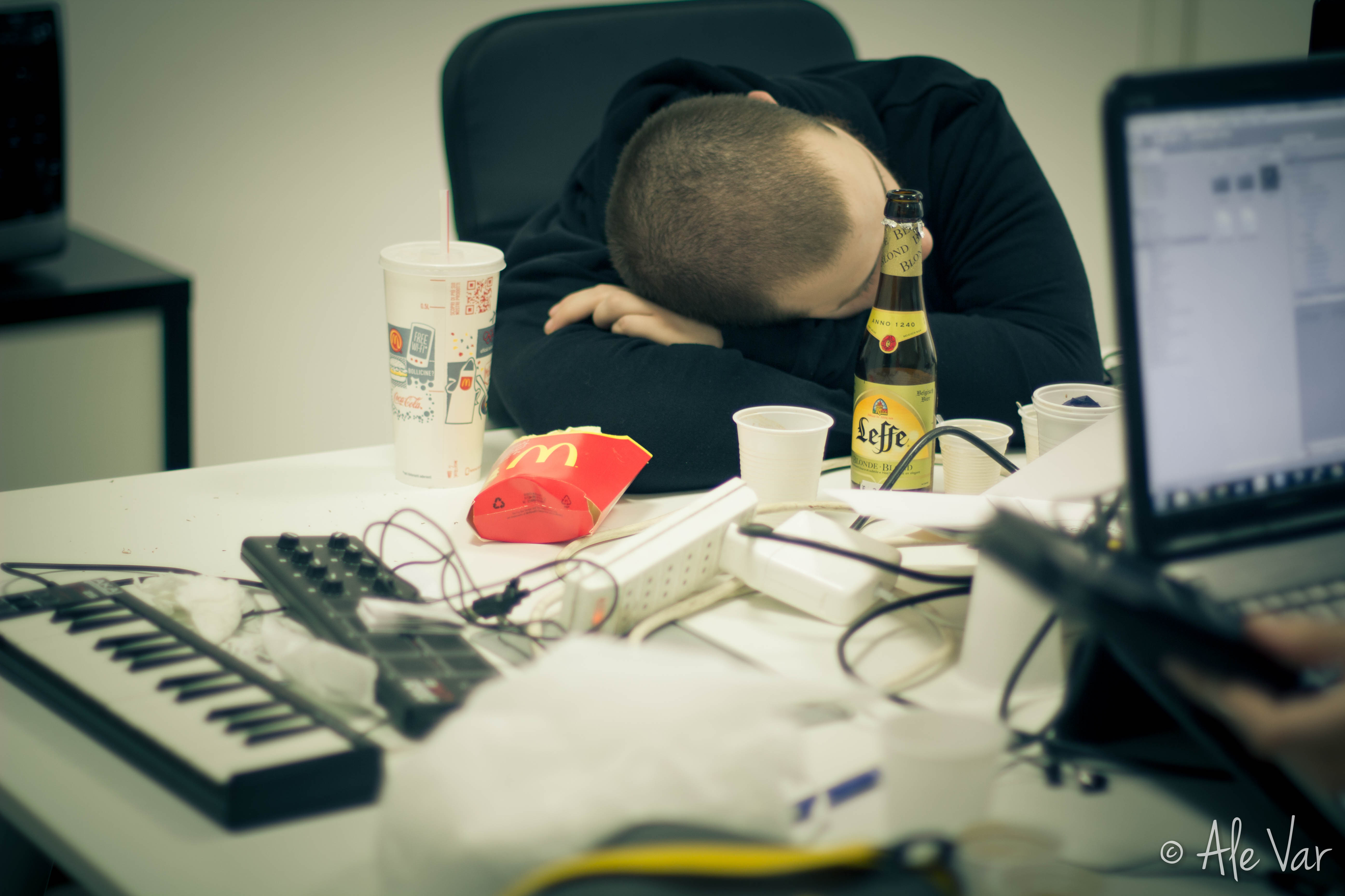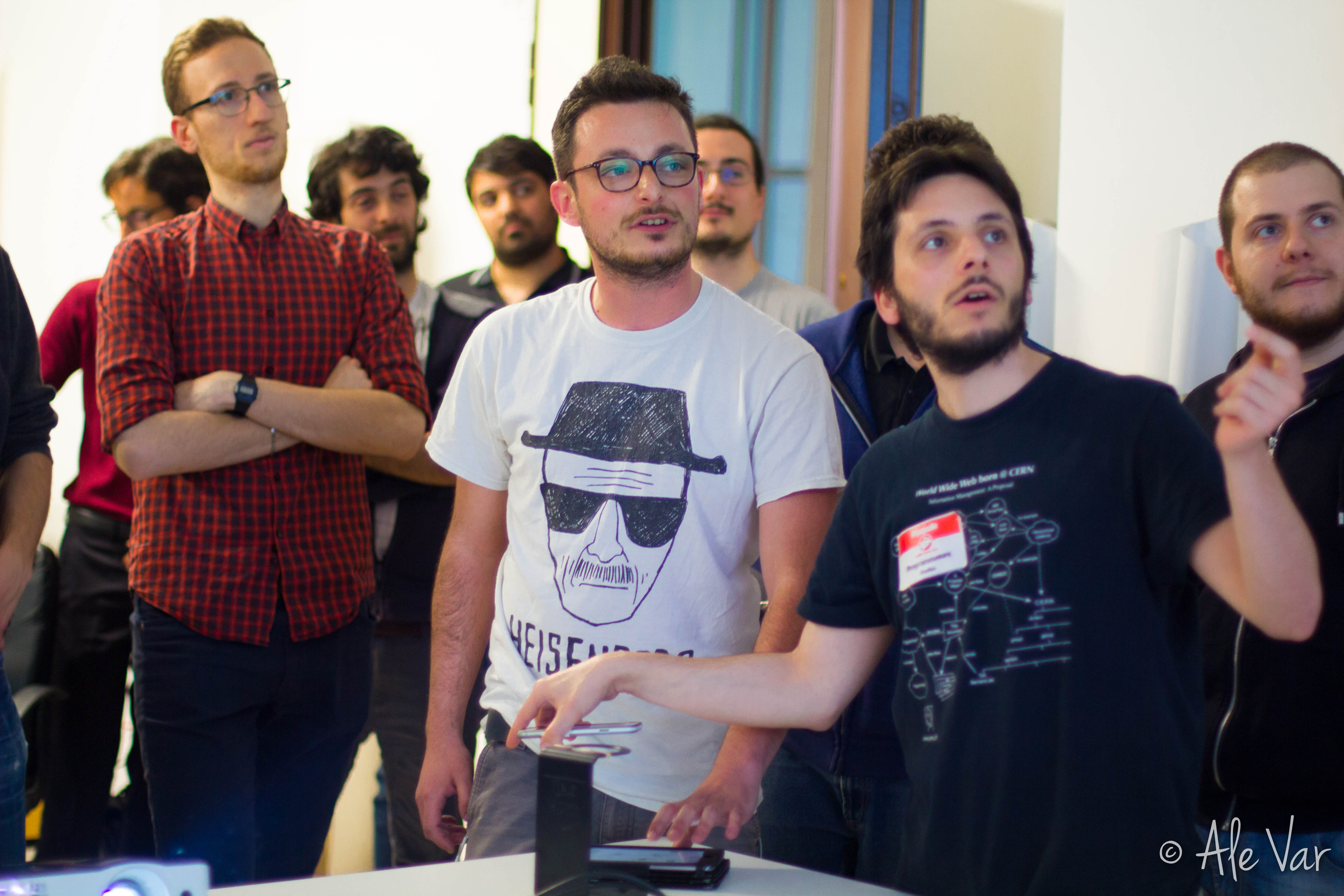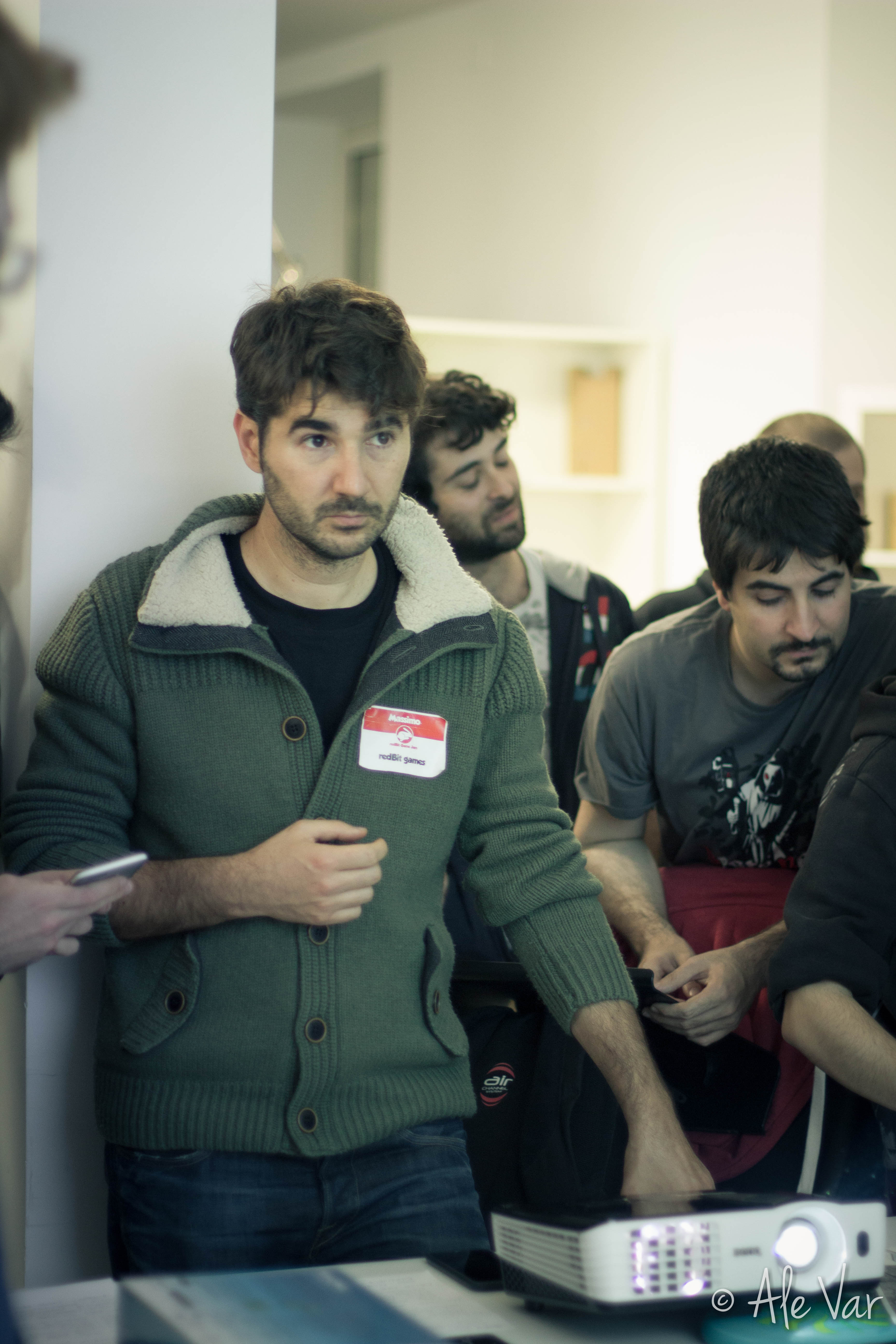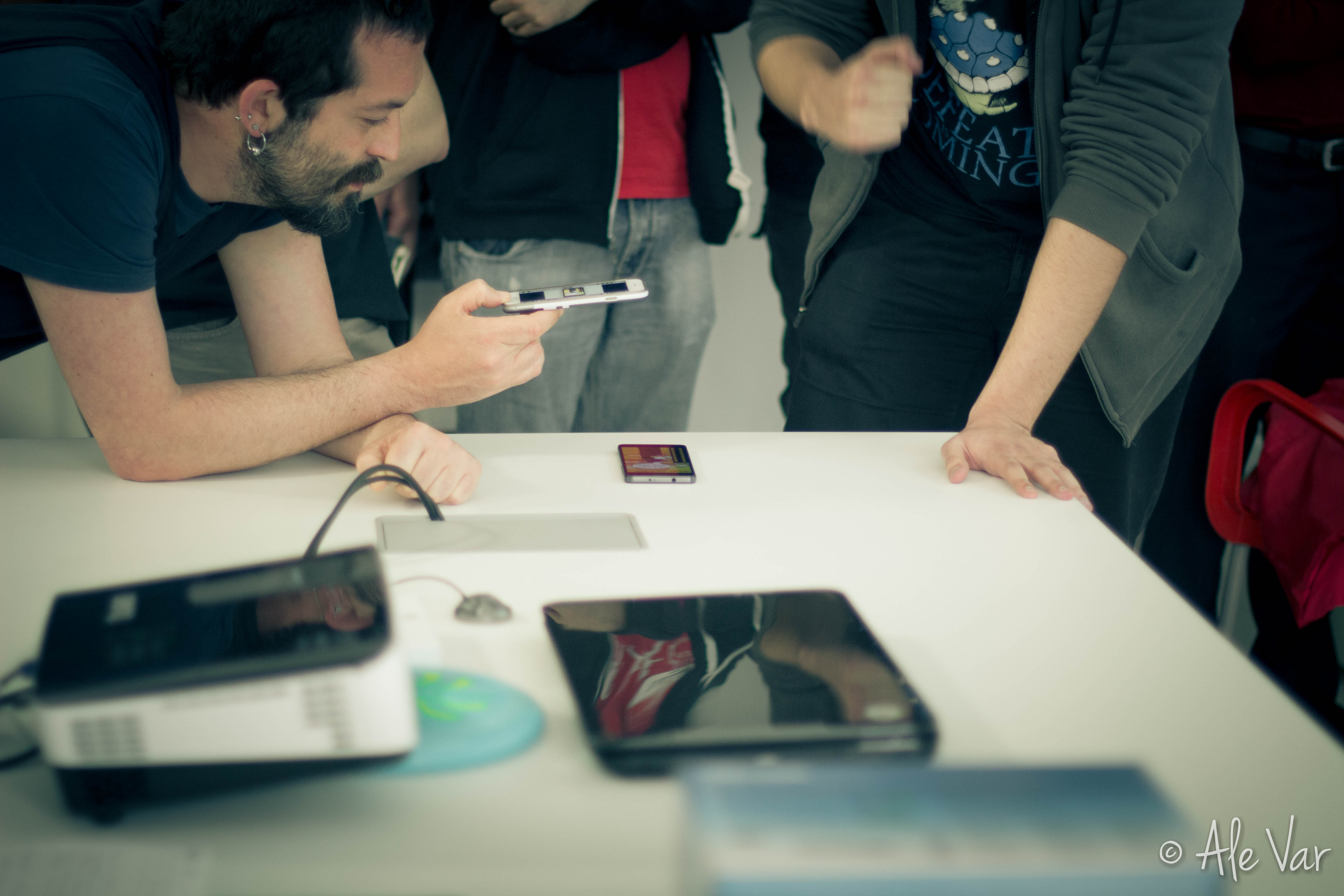 Ma andiamo con ordine. L’evento si è aperto con una pizzata generale dopo l’arrivo dei partecipanti negli uffici redBit games. Riempita la pancia era ora di riempire le teste… non ce la siamo però sentita di organizzare uno speech con tanto di slide powerpoint, per presentare chi è redBit games (potete leggerlo, in inglese, qui), il nostro lavoro, ecc ecc. Abbiamo preferito un discorso a braccio, semplice e conciso (neanche 5 minuti) per presentare l’evento e il tema della stesso, cioè Over The Edge (Oltre il limite). In sintesi? Siete qui per jammare, ora scatenate l’inferno! Pochissime regole: non formate team più grandi di 4-5 persone perché sennò non combinate niente, sviluppate un gioco per smartphone con qualunque ambiente di sviluppo, aiutatevi tra di voi e soprattutto cercate di divertirvi. E così è stato!