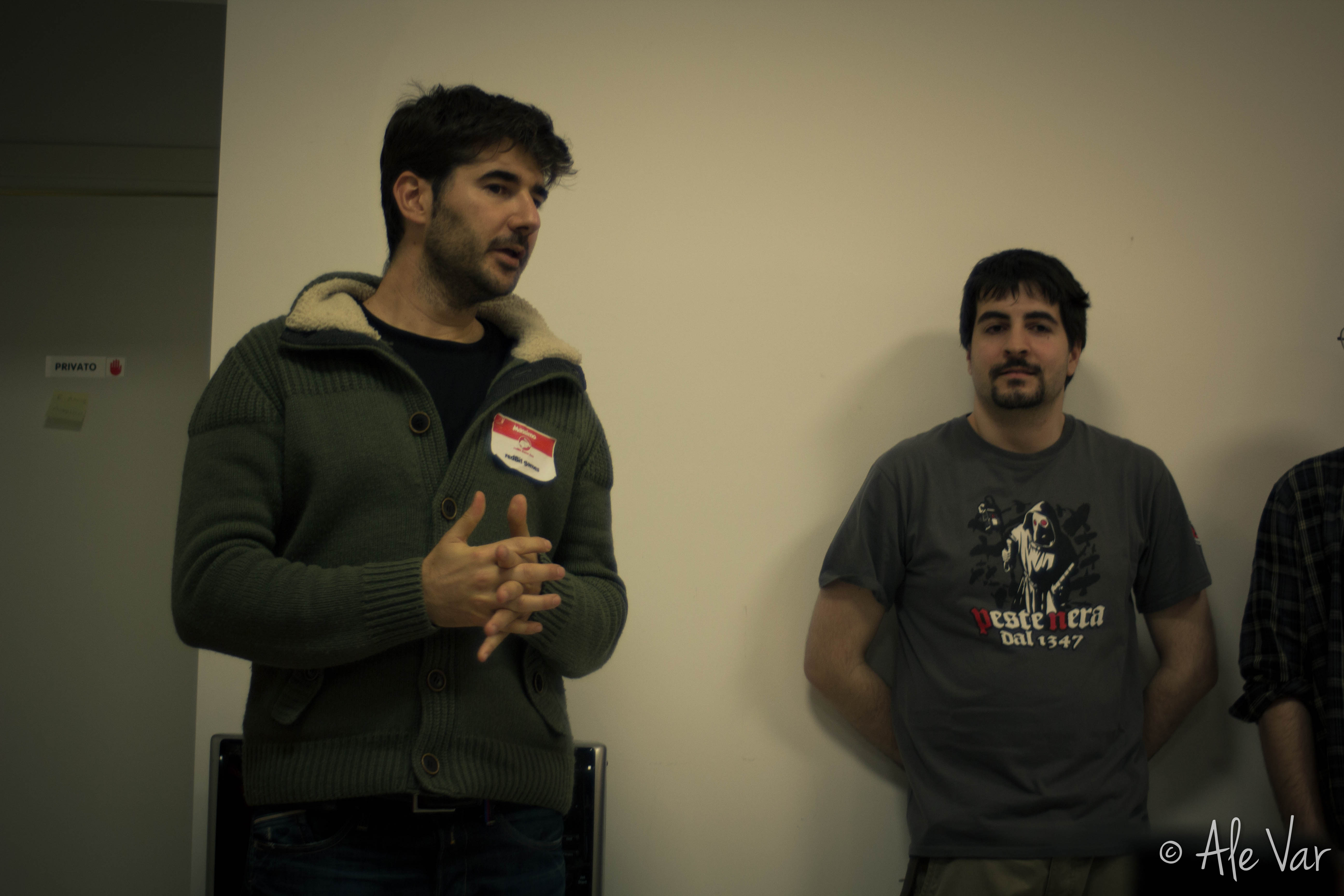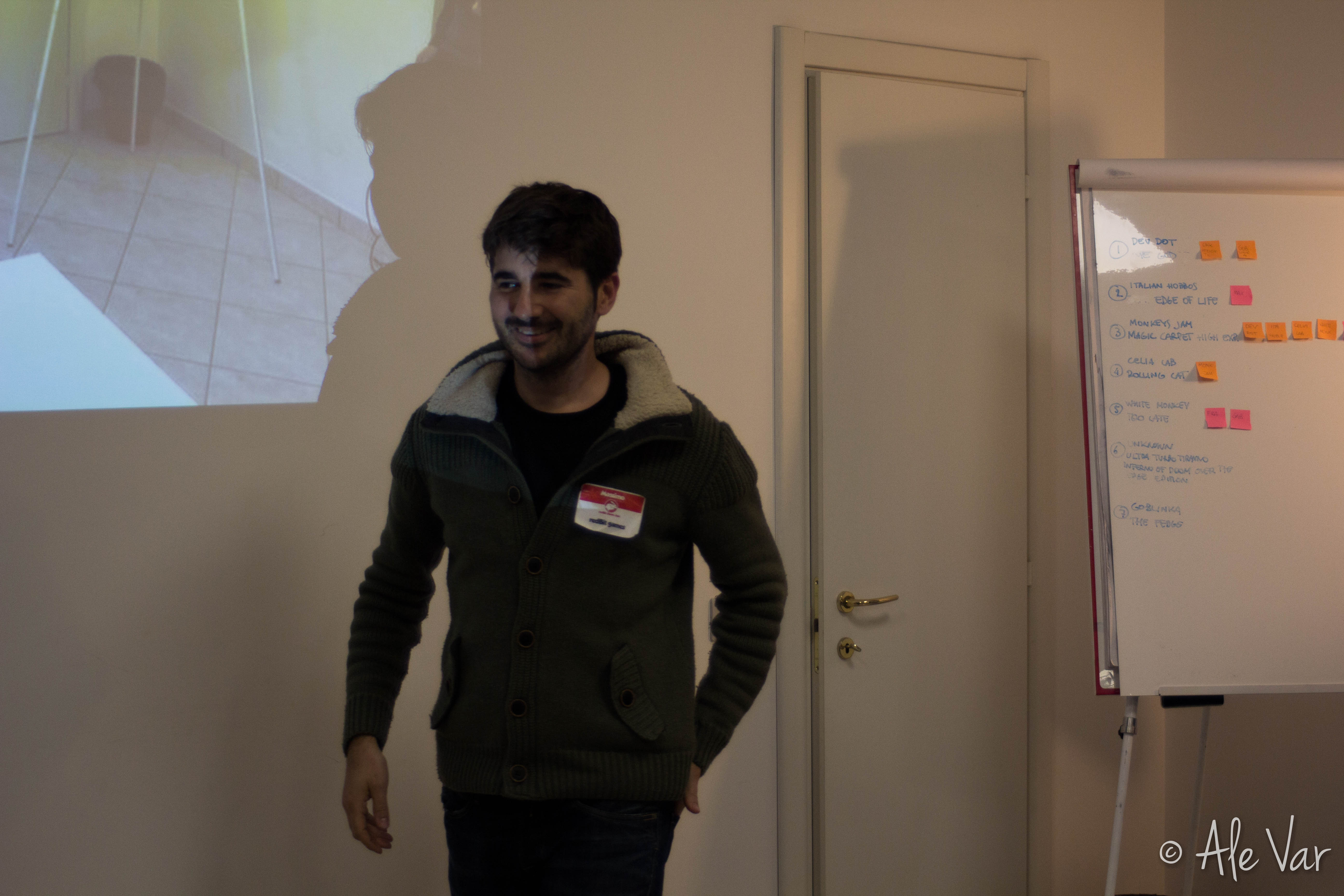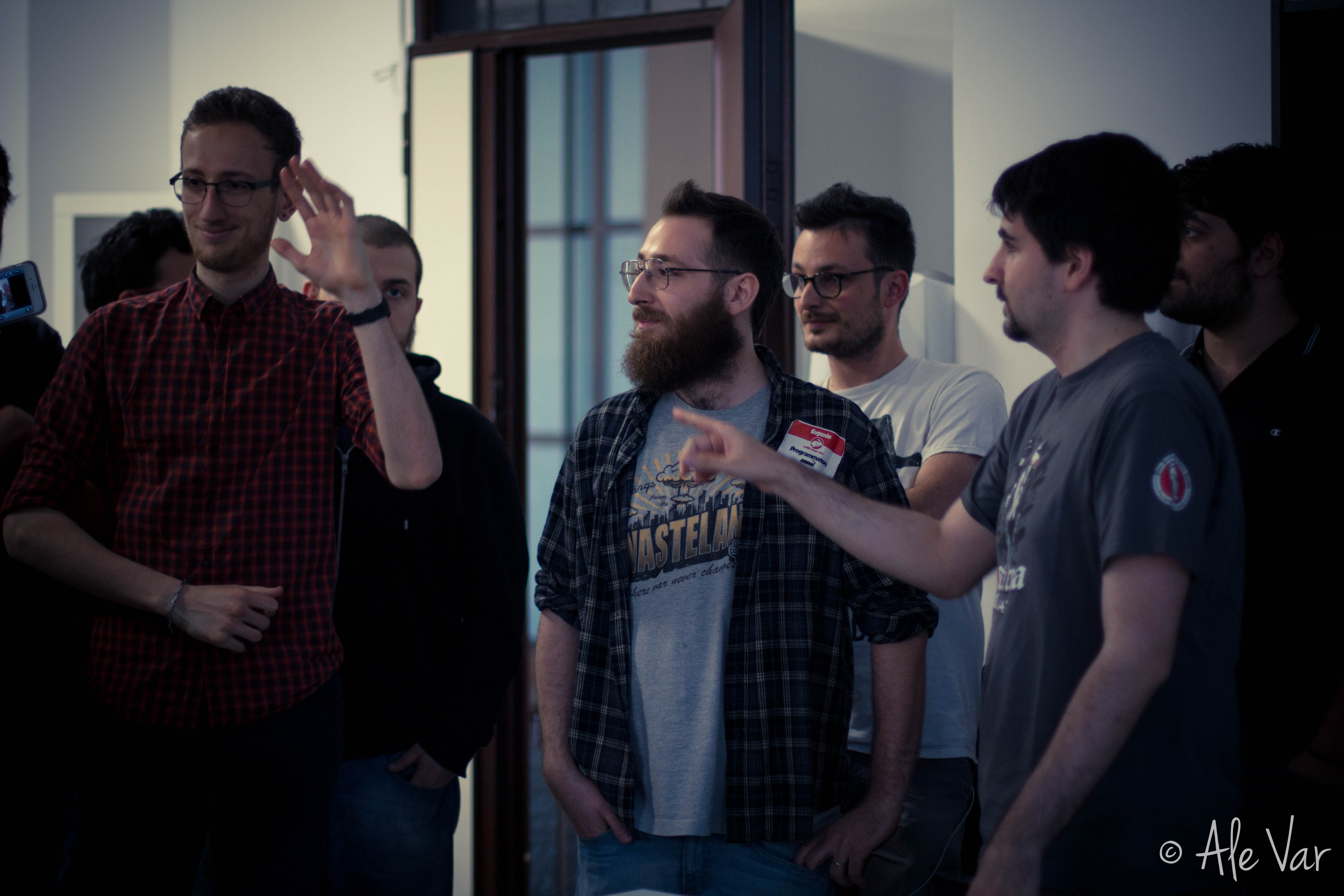 Calcio d’inizio, minuto 1. Neanche il tempo di digerire la pizza e il discorso di apertura che tutti sono già pronti a scambiarsi opinioni, chiacchere e formare i team di lavoro. Complice la bella serata e la luna piena l’innamoramento scatta subito e, grazie alla collaborazione di tutti (ad esempio degli Sleeping Volcano che erano venuti in 7 ma si sono divisi in due team), si formano sette squadre ed ognuna ha a disposizione un bel tavolone per lavorare. Andiamo a conoscerle nel dettaglio con qualche foto.