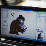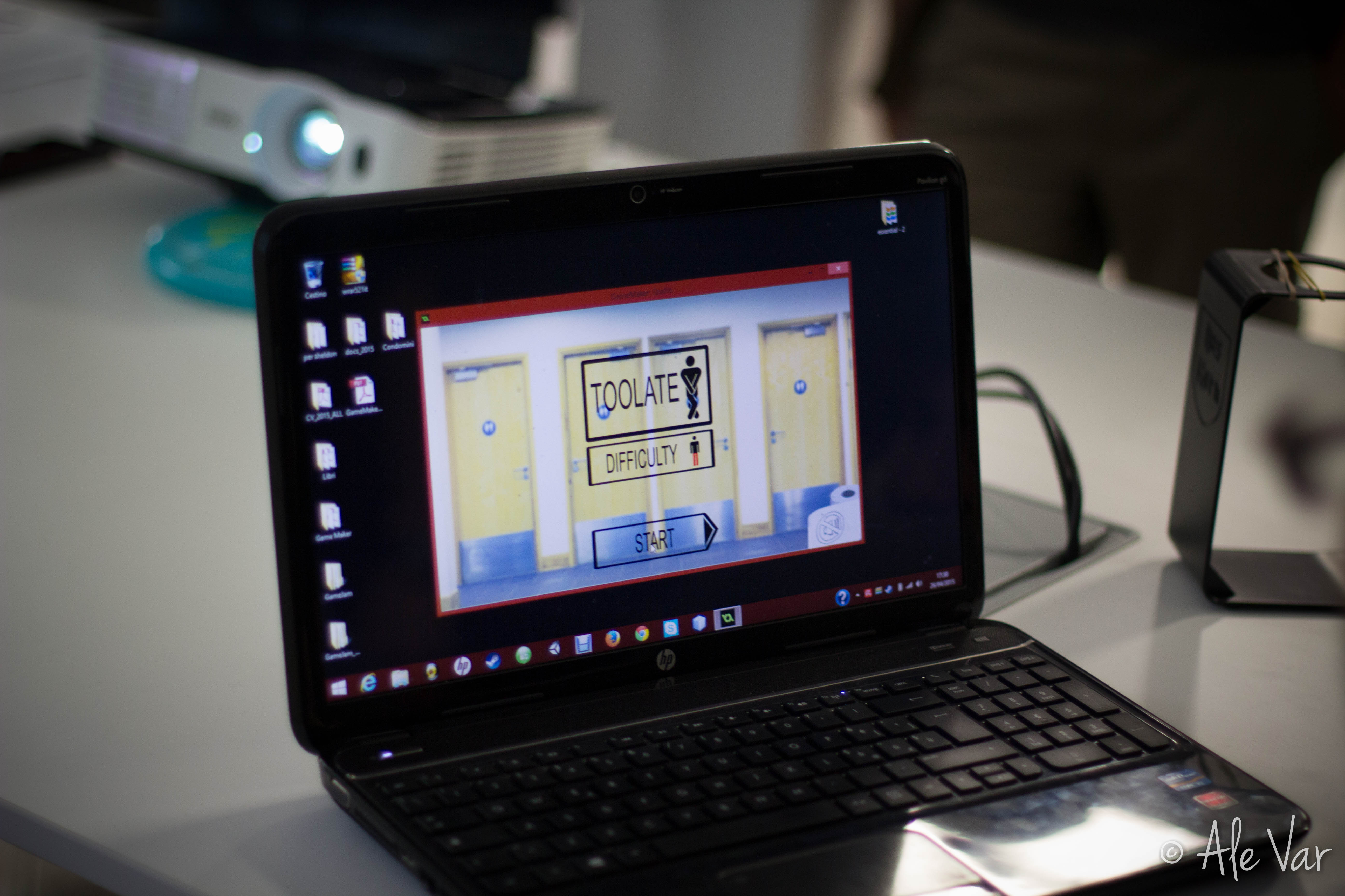 Ecco invece i White Monkey, Pietro (programmatore), Davide (programmatore) e Gianluca (grafico, programmatore). Loro sono stati autori di uno dei titoli più simpatici della jam, cioè TooLate. Il titolo è un richiamo alla parola Toilette: c’è un giovane a cui scappa la pipì, ma gli scappa davvero tanto. Farà di tutto per raggiungere il bagno prima del “disastro”: dare calci a scrivanie, schivare animali, ecc. In fondo, chi si è trovato in una situazione simile, si sarebbe comportato allo stesso modo! Contrariamente a tutti gli altri, l’ambiente usato per sviluppare TooLate è stato GML.